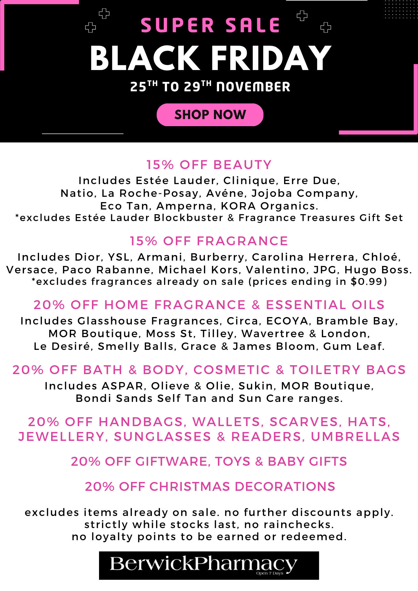 From Tuesday 25th to Saturday 29th November, Berwick Pharmacy are hosting our biggest sale of the year, the Black Friday sale!