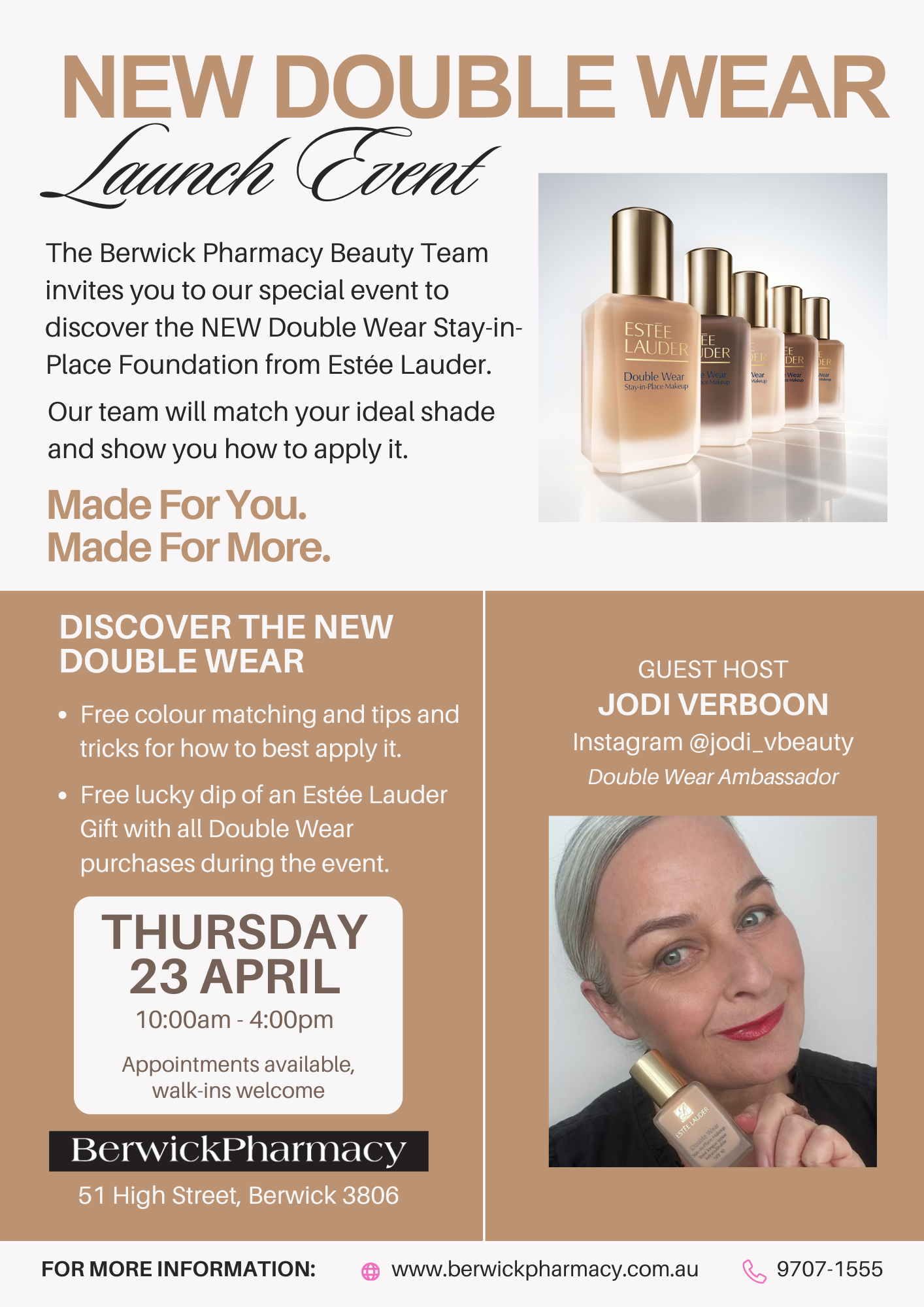Join us at our special Double Wear Launch Event on Thursday 23rd April 2026. From 10am to 4pm, we'll have Jodi Verboon, a Double Wear ambassador, and the creator behind the instagram account, @jodi_vbeauty, who will be in-store to share her extensive knowledge and experience about Estee Lauder products.