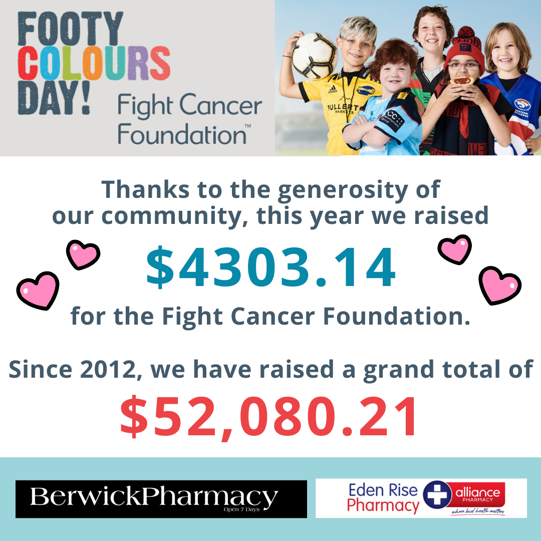WOW! Thanks to the generosity of our community, between Berwick Pharmacy and Eden Rise Pharmacy, we raised $4304.14 for our Footy Colours Day fundraiser!